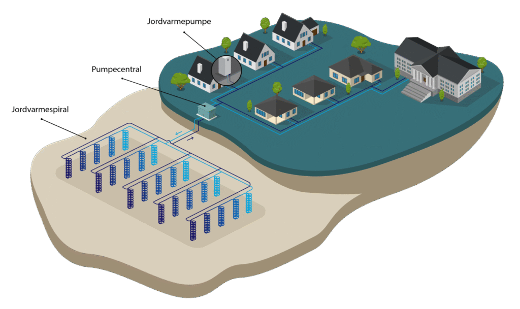 Væsken, som typisk består af 70% vand og 30% sprit, cirkulerer rundt i et lukket rørsystem og leverer varmeenergi til bygningernes varmepumper, der så opvarmer det til den temperatur, der er nødvendig for at opvarme boligerne eller levere varmt vand.